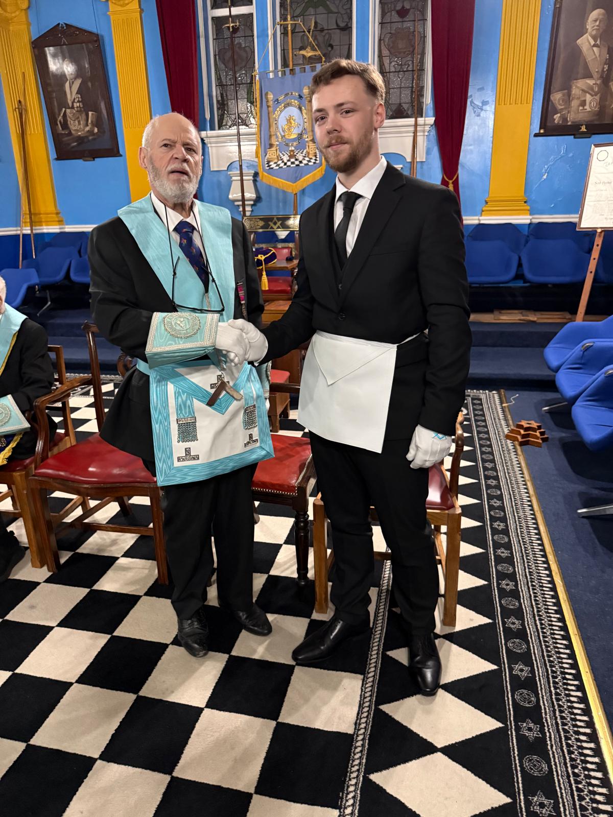 The ceremony to initiate Mr Callum Scott Thomas was mainly conducted by past masters, with WBro. Eric Pope acting as Worshipful Master, WBro. David Hiscock delivering the charge in the NE, WBro. Roy Coenye presenting their long and different version of the working tools, and finally the charge after initiation being delivered by WBro. Sefton Davis who being less than a month away from his 87th birthday did it with efficiency and aplomb.